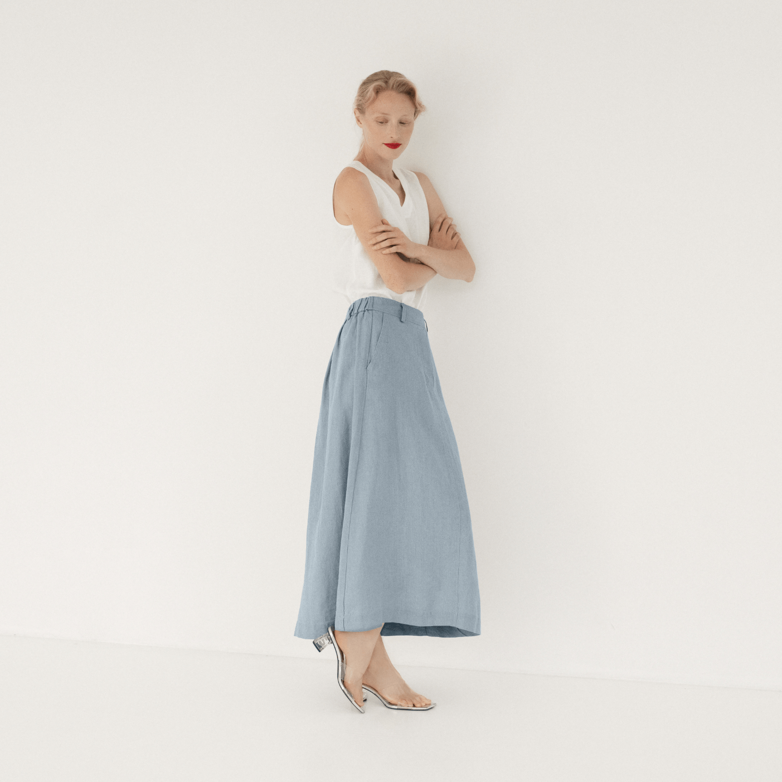 This incredibly versatile piece features delicate ruffles, belt loops, and decorative hem and zipper imitation in front. Style it with minimalistic tops and unbuttoned shirts for an infallible outfit, or pair it with jackets or wool knits for something more adventurous and creative.
