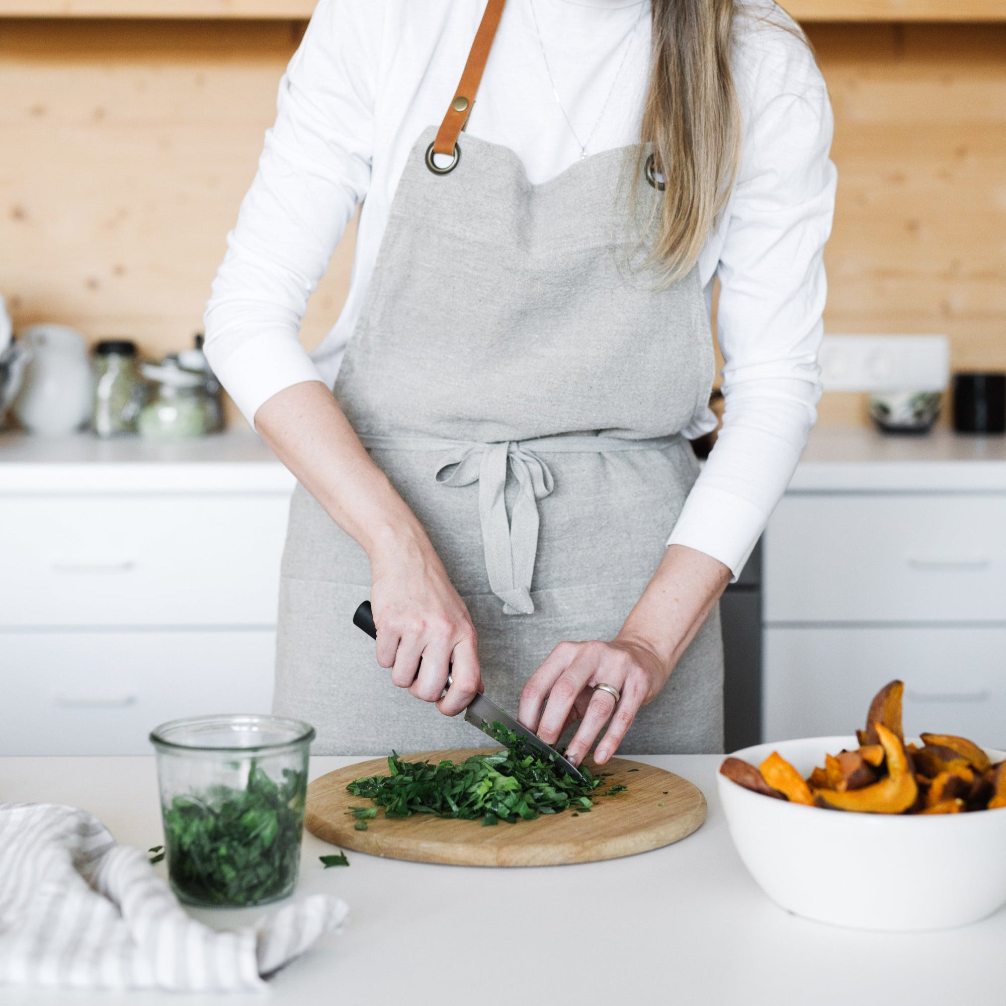 A gender-neutral heavy-duty Linen Luxury Apron for any seasonal cooking day. A handy pocket helps to keep the essentials you might need for the cooking process. Easy to adjust, stylish, and highly durable 100% linen material.