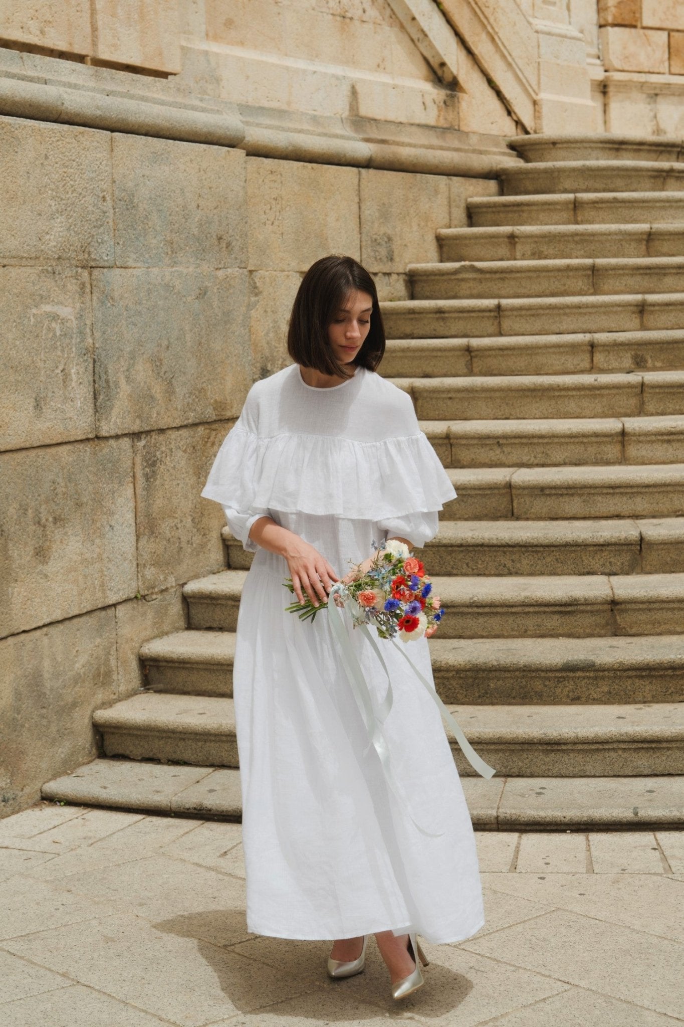 The Fantasia dress radiates elegance, making it a stunning choice for special summer occasions, including weddings. Crafted from delicate linen, its flowing silhouette offers timeless sophistication, while the perfect styling touches can transform it into a chic, casual ensemble for more relaxed settings.